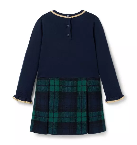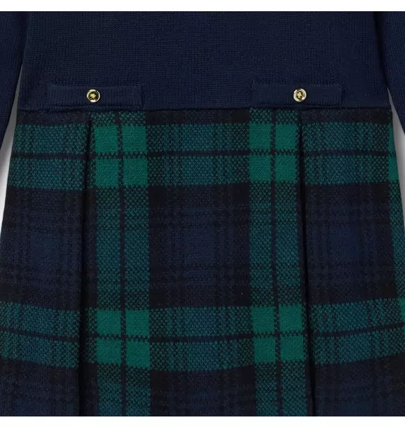As cozy as it is stylish, our sweater dress is a favorite all season long. With a cozy knit top featuring ruffle cuffs and contrast trim, plus button details and a classic pleated tartan skirt in soft jacquard.